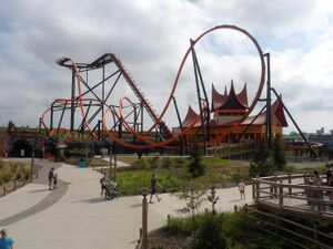 * Fire Runner was placed in such a way that when viewed from the entry courtyard, the drop appears to dive into the Volkanu volcano. | |||
