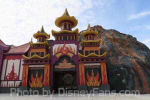 Much of the story is recapped in the attraction's pre-show video where an unseen Hulaka, the Tamariki of Strength, recruits guests to help recover the idol with the Inferno Transports, vehicles built with the cooperation of the four realms and armed with Thermal Equalizers, energy guns harnessing the magical power of all four elements that can harm Volkanu and his lava minions. Passing through a second queue room with a firepit illuminating shadows of characters from all the realms, guests pass by an animatronic of Tago Nui, the Mura Shaman, who offers encouragement and a lead on the idol's location at the Forbidden Grotto before guests pick up their 3D glasses and arrive at the load station. | |||